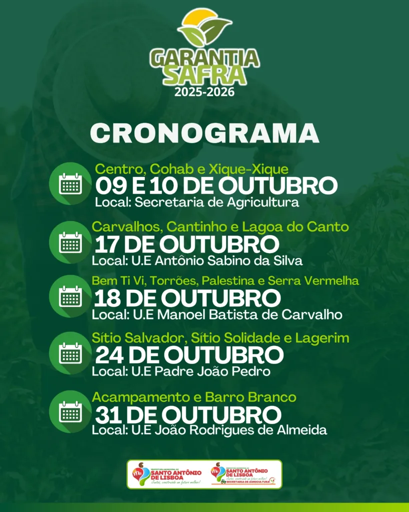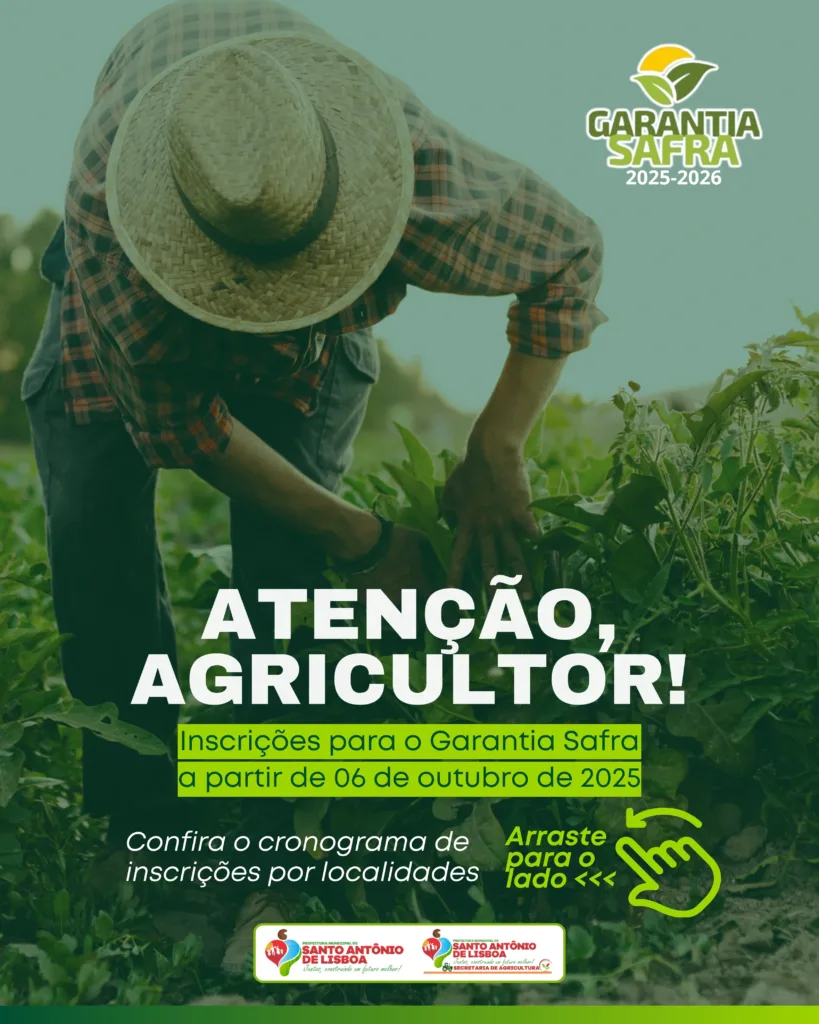 A Prefeitura de Santo Antônio de Lisboa, por meio da Secretaria de Agricultura, informa que as inscrições para o programa Garantia Safra 2025/2026 terão início no próximo dia 06 de outubro.